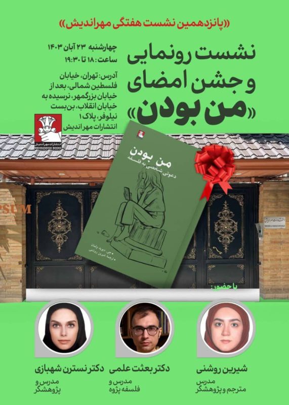 📚 پانزدهمین نشست هفتگی و مراسم رونمایی و جشن امضای کتاب “من بودن” نوشته ولمان با ترجمه شیرین روشنی روز بیست و سوم آبان ماه در دفتر انتشارات مهراندیش برگزار شد.