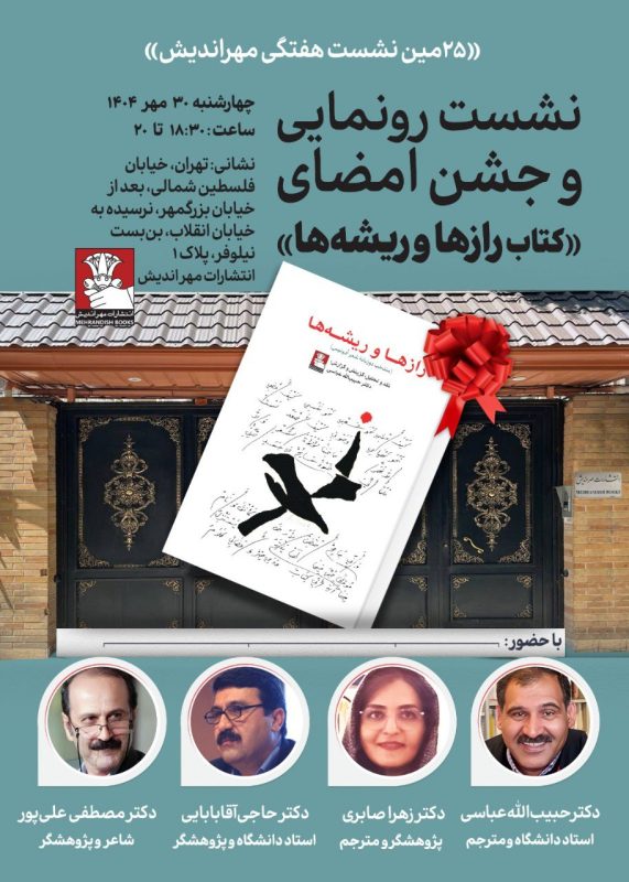 📚 بیست و پنجمین نشست هفتگی و مراسم رونمایی و جشن امضای کتاب “رازها و ریشه‌ها، منتخب دوزبانه اشعار آدونیس” با ترجمه جناب آقای دکتر حبیب الله عباسی ۳۰ مهر ماه در دفتر انتشارات مهراندیش برگزار شد.دکتر مصطفی علی‌پور نتوانستند در این جلسه حضور پیدا کنند اما پیامی را درباره این ترجمه جذاب ارسال کردند که توسط سر کار خانم سجودی مقدم برای حاضران قرائت شد.