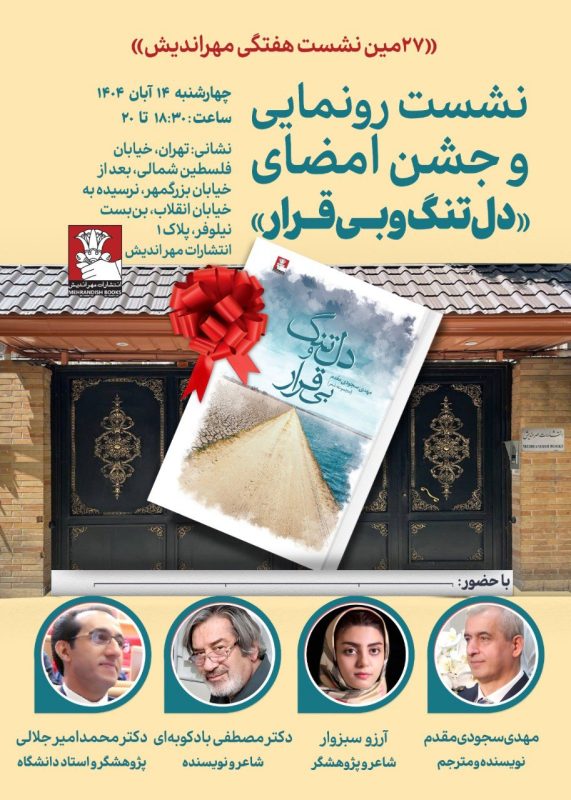 📚 بیست و هفتمین نشست هفتگی و مراسم رونمایی و جشن امضای کتاب “دلتنگ و بیقرار” اثر جناب آقای مهدی سجودی مقدم چهاردهم آبان ماه در دفتر انتشارات مهراندیش برگزار شد.