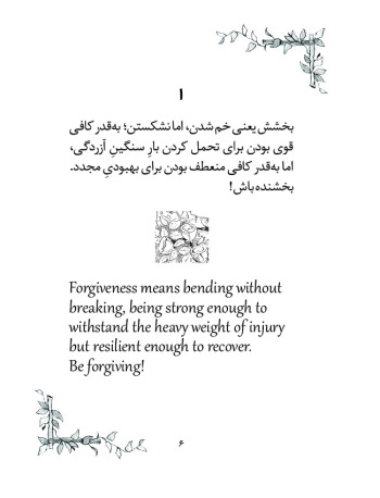 توصیههای این کتاب کمک میکند تا با بازیابی عواطف خدادای و تواناییهای روحیٰ از غیظ و خشم رها شوید و به جادهٔ روشنِ گذشت و بخشش قدم بگذارید، ممکن است با بعضی از آنها موافق نباشید و از بعضیها هم البته، لذت ببرید ـ اما بدون شک به شما خواهد آموخت که قدر زندگی را بدانید و آن را بهعنوان بزرگترین موهبت انسان تکریم نمایید